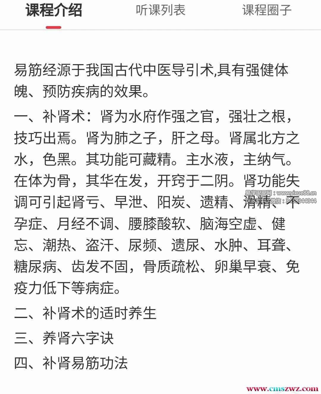 课程编号:Y2406-124课程介绍:易筋经源于我国古代中医导引术,具有强健体魄、预防疾病的效果。一、补肾术:肾为水府作强之官,强壮之根技巧出焉。肾为肺之子,肝之母。肾属北方之水,色黑。其功能可藏精。