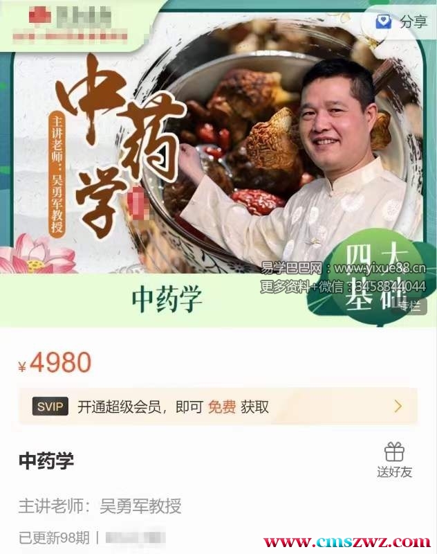 课程编号:Z2403-09中药学 全98讲 高讲手课,幽风默趣,一就学会吴勇军,教授、中学药学科带头人,高工级程师。湖南中医大药学临床中学药教研核室心骨干,湖中南医