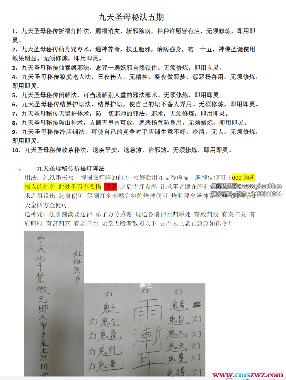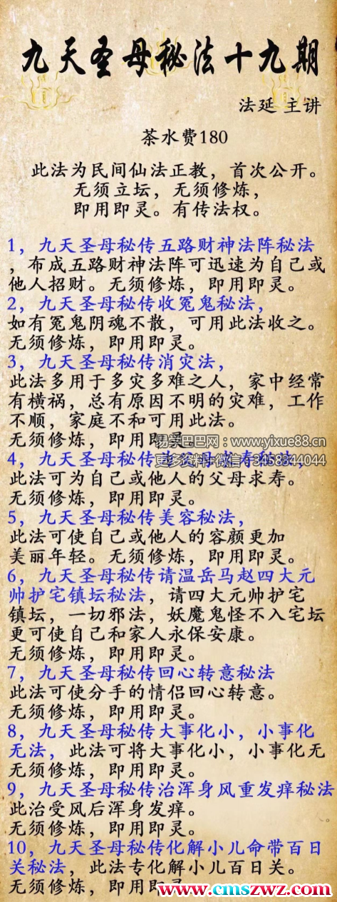 2,九天圣母秘传文昌法事,此法可为福主速招文昌,使学业,事业猛进,无须修炼,即用即灵。