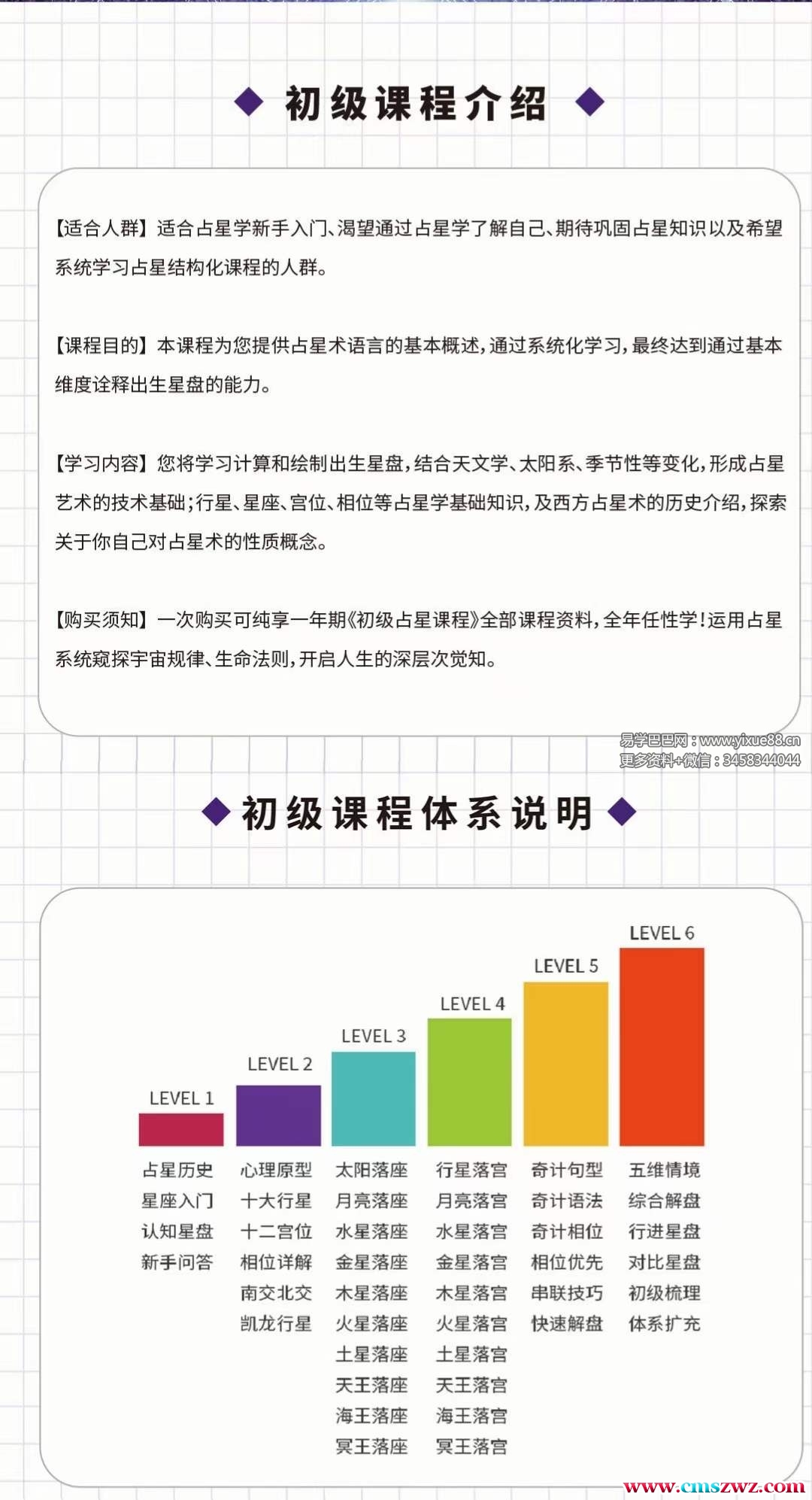 课程编号:X24003心理星图金牌必修课一到三阶课程,新手系统入门,具体目录见截图初级课程介绍【适合人群】适合占星学新手入门、渴望通过占星学了解自己、期待巩固占星知识以及希望系统学习占星结构化课程的人