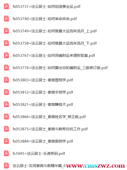 法云居士老师资料合集,包括面相,紫微,手相,姓名学等等。(电子版)具体目录如下:法云居士-紫微赚钱术法云居士如何推算大运流年流月上法云居士-如何用偏财运来理财致富法云居士-紫微手相学法云居士-如何创造事业运法云居士实用紫微斗数精华篇 法云居士-乐透密码 法云居士-紫微屋相学 法云居士紫微斗数帮你找工作法云居士如何推算大运流年流月下法云居士-如何算出你的偏财运(三版修订版)法云居士-实用紫微斗数精华篇法云居士紫微面相学 法云居士-如何审命改命 法云居士紫微姓名学_修正版..
