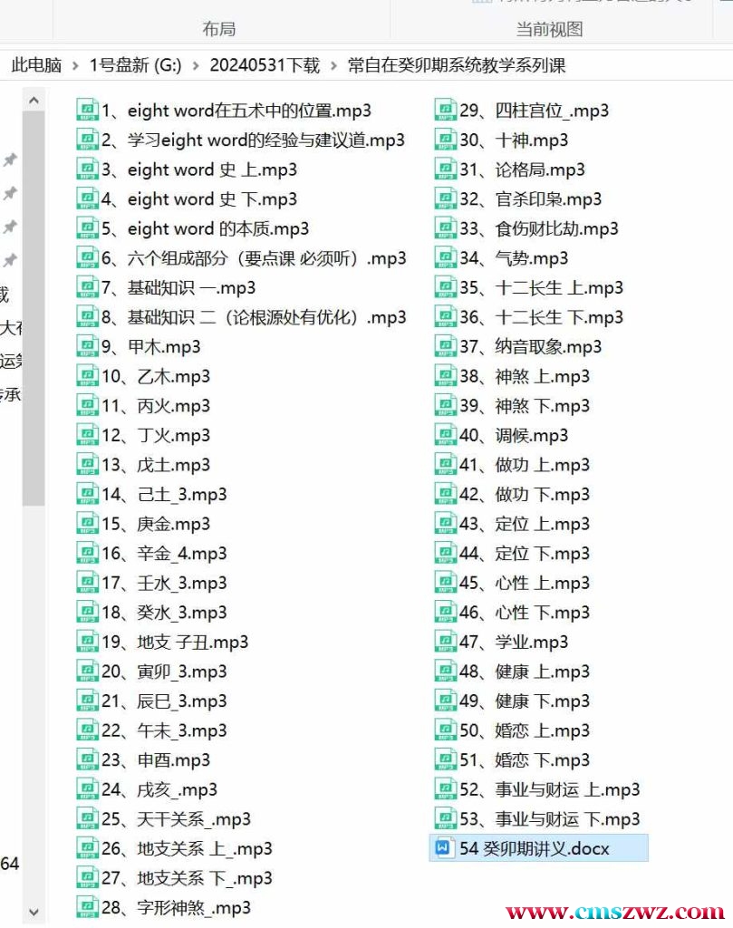 八字推命做功、天干关系_、地支关系 上、四柱宫位、纳音取象、论格局.常自在癸卯期系统教学系列课录音53集+资料!!!本系列课是完整、专业、实操性强、干货极多的八字教学课程。从基础到精深,一套课程全部教完;本期课程对象法、定位做了大量的拓展和实例教学,令学员能够拥有灵活的取象思维,从而在实践时断出更为精准的细节;