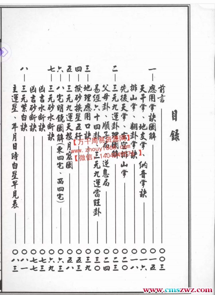 一.應用掌訣圖解 天干掌、地支掌、納音掌訣 排山掌、翻卦當訣 先後天掌、玄空排山掌二.三元九運卦理圖解 父母卦、順子局、逆息局 易經六十四卦、三元九運當旺卦三.地理應用口訣四.撥砂挨星五行五.三元九運天根月窟圖六.八宅明鏡圖解(東四宅、西四宅)七.三元砂水斷訣 凶吉水斷訣 凶吉砂斷訣八.三元紫白訣 主運星、年時白星早見表 三元紫白星主運圖解 三元生旺方、死退殺氣方斷訣 三元山水紫白挨星訣 壬子癸丑艮寅山、山水值吉圖解 甲卯乙辰巽巳山、山水值吉圖解 丙午丁未坤申山、山水值吉圖解 庚酉辛戍乾亥山、山水值吉圖解九.玉樓經安福德訣廿四山吉凶圖解 安福德、安質庫活盤製作十.三元玄空訣 上元廿四山玄空大卦圖解 中元廿四山玄空大卦圖解 下元廿四山玄大卦圖解 三元九運廿四山下卦起星圖 三元玄空訣應用詳解十一.地理明師應具備之用事口