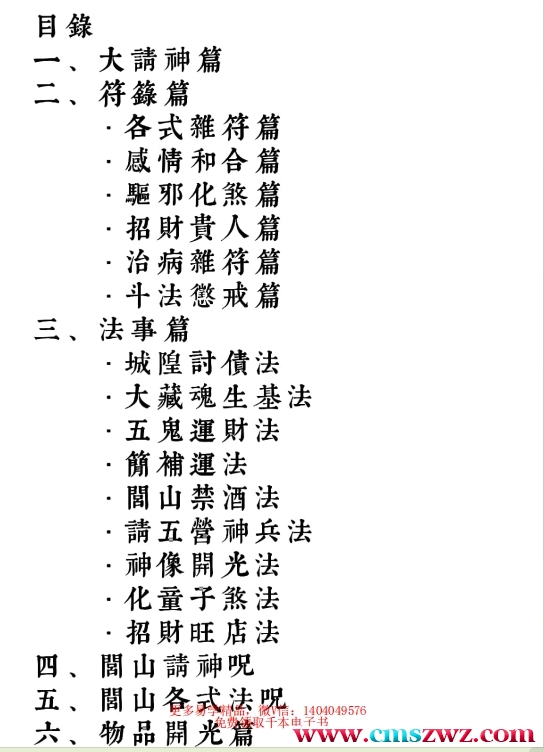 本法脉由台湾传过来,属于闾山法的一个分支,是闾山威灵公派,供奉城隍土地黑白无常,置下坛,此套法脉非常刚猛,效果非常好。目錄一、大請神篇二、符篆篇·各式雜符篇.感情和合篇·驅邪化煞篇·招財貴人篇·治病雜符篇·斗法懲戒篇三、法事篇·城隍討債法·大藏魂生基法·五 鬼運財法簡補運法·閭山禁酒法·請五營神兵法·神像開光法·化童子煞法·招財旺店法四、閭山請神呪五、閭山各式法呪六、物品開光篇..