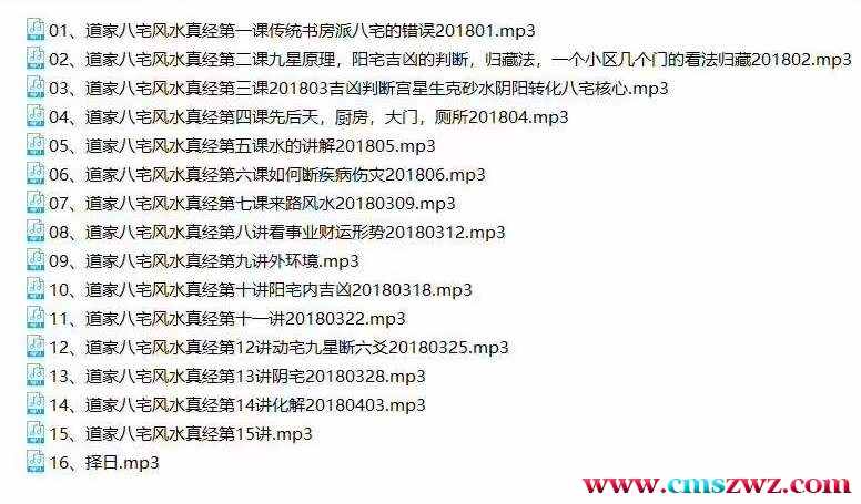资料介绍和常见的传统书房派八宅有区别。住宅断事和化解。讲了星宫生克和砂水阴阳的转化,小区多个大门的归藏法,如何择日等等。录音清晰。资料目录