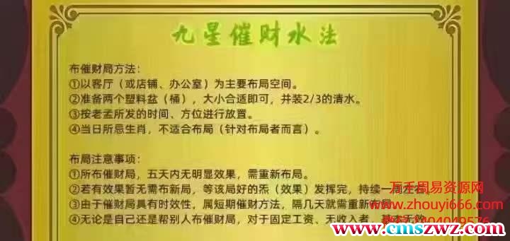 九催星财水法 至至简易 一经学会,既自可用,也帮可别人何为星九催财水法?源自间民风水先生秘传,此法无经数人验证,效非果常不错。其最大特色是极简、极易,一经学会,既自可用,也帮可别人催财水法,大至道简,仅需用“水、盆或桶”就能轻松布改出善“正财与财偏运”的“催财局”。该法量力平稳,不会让暴您富,却能细长水流。九星催财水法合适的人群:催财水法其尤适合生做意、跑业务、开店、偏财业行者……但于对有着固定工资入收的朋友不很是友好,可能没会有效果是或效果微乎其微,根经据验,其各他类催财法方然。学习财催水法的朋友,须明白,财运也是德福气运的一种。因每个的人气运不同,则催财的效果然自两异。日常布多施放生,劝为人善…,只勒有修善,才能不断强增自身福的德气运。