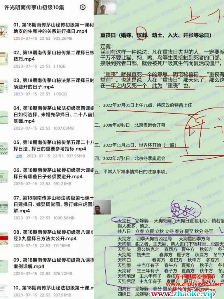 01、第18期南传茅山秘传初级第一课利用地支的生克冲的关系进行择日.mp402、第18期南传茅山秘传第二课择日核心技巧.mp403 第18期南传茅山秘法第三课择日时必须避开的日子mp404 第18期南传茅山秘法初级第四课婚嫁日如何选择、未婚先孕择日、二十八宿择日基础mp405、第18期南传茅山秘传第五课二一八宿择日法、择日的重要参考指标.mp406、第18期南传茅山秘传初级第六课婚嫁择日有哪些日子必须要避开mp407、第18期南传茅山秘法初级第七课十二日建择日、嫁娶周堂图、忌行嫁白虎图的讲解mp408、第18期南传茅山秘传初级第八课《金符经》九星择日方法大公开mp409、第18期南传茅山秘传初级第九课择日案例详解mp410、第18期南传茅山秘法初级第十课mp4