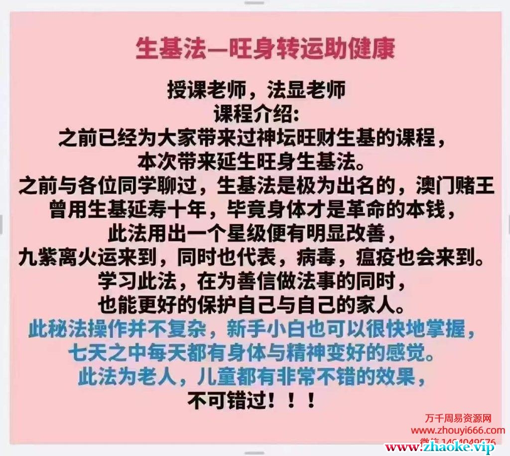 无需修炼与立坛。之前已经为大家带来过神坛旺财生基的课程,本次带来延生旺身生基法。