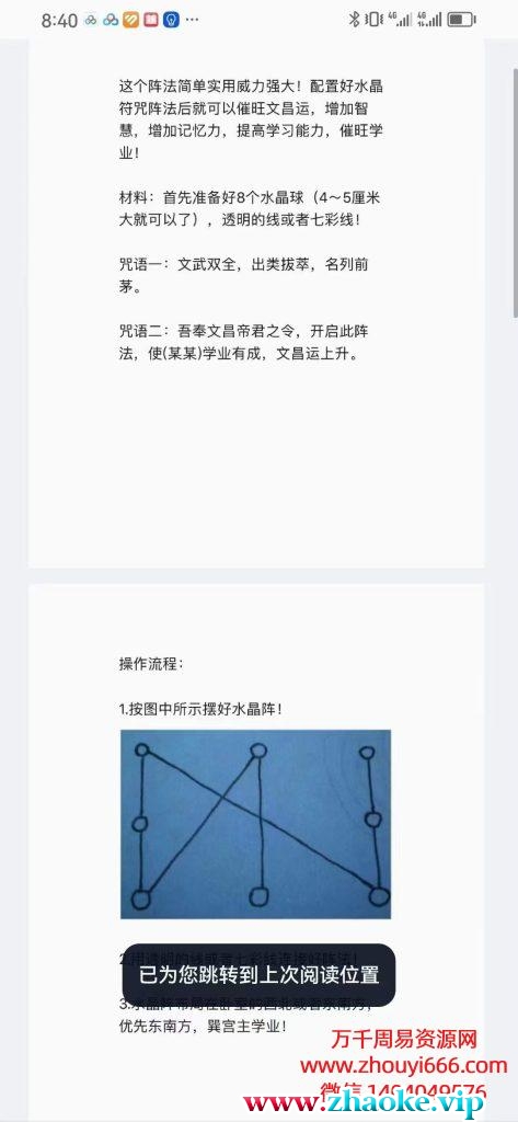 资料介绍这个阵法简单实用威力强大!配置好水晶符咒阵法后就可以催旺文昌运,增加智慧,增加记忆力,提高学习能力,催旺学业!资料预览资料目录