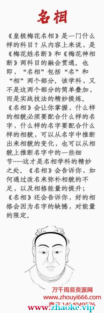 《皇极梅花名相》是一门什么样的科目?从内容上来说,是《梅花姓名断》和《梅花神相断》两科目的融会贯通。也即,“名相”包括“名”和“相”两个部分。该学科,又不是这两个部分的简单叠加,而是实战技法的精妙提炼。《名相》会让你掌握,什么样的相貌必须要配合什么样的名字,什么样的名字要配合什么样的相貌,可以从名字中推断出来相貌的变化,也可以从相貌上推断名字中的一些细节……这才是名相学科的精妙之处。《名相》会告诉你,如何通过改名来弥补相貌的不足,以及相格能量的提升;《名相》还会告诉你,好的相格会因为名字的缺憾,对能量的限定。