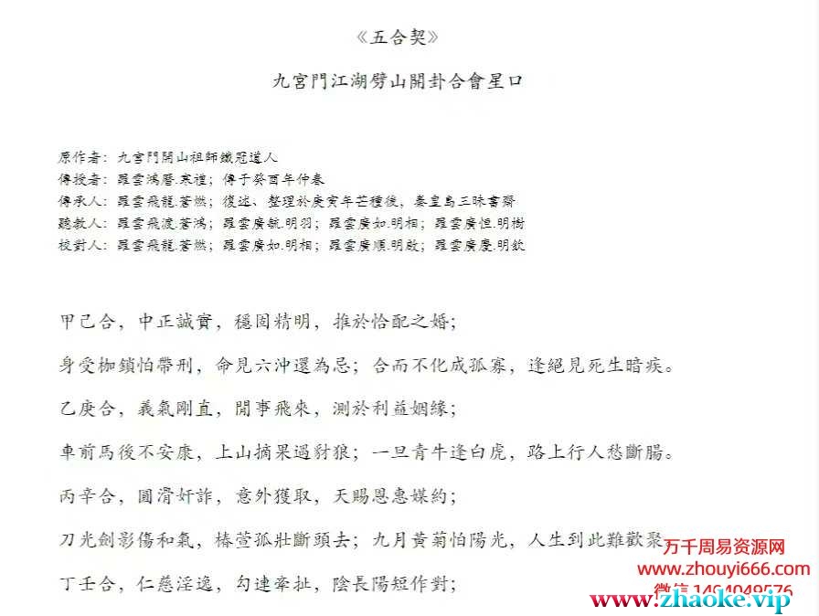 《五合契》 九宫门江湖劈山开卦合会星口 原作者:九宫门开山祖师铁冠道人。 传授者:罗云鸿历.寒礼;传于癸酉年仲春。 传承人:罗云飞龙.苍燃;复述、整理于庚寅年芒种后,秦皇岛三昧书斋。 听教人:罗云飞渡.苍鸿;罗云广毓.明羽;罗云广如.明相;罗云广恒.明树。 校对人:罗云飞龙.苍燃;罗云广如.明相;罗云广顺.明启;罗云广庆.明钦。 注:天下大事分久必合,合久必分,合中必有一克。 天干有五合,地支有六合,五合连六合,多波而不绝,天干五合如甲己合,乙庚合为夫妻之正合,六合中子丑合为克合,寅亥合为生合。 天干合合为表象,地支合为内在,十天干可代表十种人,可为十分法。 五阳干可代表五种男人,五阴干可代表五种女人,。 十天干配十二地支,分成六甲旬空, 阳多必争阴,阴多必争阳,阳多必争阴,必出战争,阴多必争阳,必出瘟疾。 甲己合,中正诚实,稳固精明,推于恰配之婚; 身受枷锁怕带刑,命见六冲还为忌;合而不化成孤寡,逢绝见死生暗疾。 注:甲有中分,己为端壮,甲己合土,土为诚实稳重,土可培植甲木之根,甲木可培植己土避免水土流失。 甲己合中间需有媒妁之言,三媒六证,有媒婆,尊父母之命。丁壬则有私奔之象,无媒而娶。 甲己合有身受枷锁之象如地支带刑,则受制又受克还不能散伙。例:甲子 己卯 甲己合子卯刑