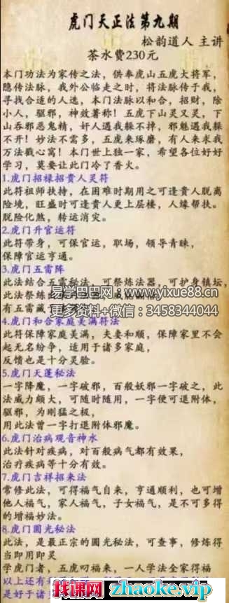 松韵人道主讲:本门功法为家之传法,供奉虎山虎五大将军,隐法传脉,我外公临之走时,将法传脉于我,寻合找适的人选,本法门脉以和合,招财,除小人,驱邪,神效著称!五下虎山灵又灵,下山邪吞恶鬼精,奸人我遇躲不掉,邪魅遇我不躲开!妙法需不多,五来虎琢磨,有来人求我万戳法心窝!本门世上独一家,希望各好位好学习,莫要让门此冷了香火。