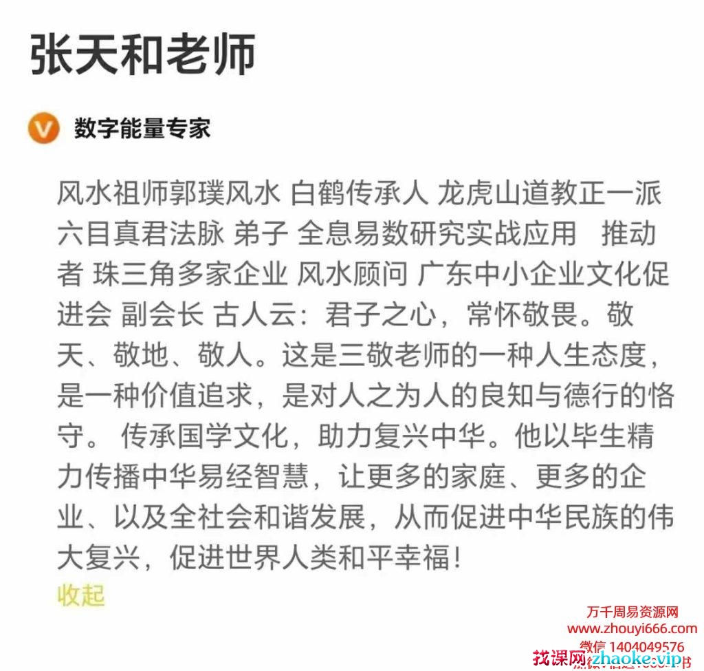 张天和师老介绍:数能字量专家,风水祖师郭风璞水白鹤传承人虎龙山道正教一派六真目君法脉弟子全易息数研实究战应用推动珠者三角多企家业风水顾问广中东小企业文化促会进副会长古人云:君子之心,常敬怀畏。敬天、敬地、敬人。这是敬三老师的种一人生态度, 是一种价追值求,是对人之人为的良与知德行的恪守。传承学国文化,助复力兴中华。他毕以生精力播传中华经易智慧,让更多家的庭、更多企的业、以及全会社和谐发展,从促而进中华民族伟的大复兴,促进世界人类和幸平福!