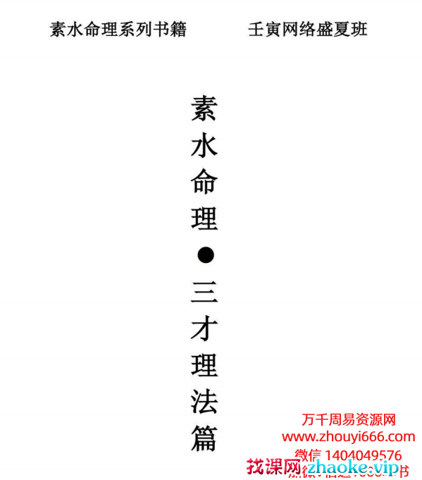 第一章 格局与用神第二章印格的配置与喜忌附:关于排行的论法第三章 枭印配置与三才思想第四章八字的正确打开方式1:阴阳辩证第五章八字的正确打开方式2:官的辩证第六章 伤官成格与用神层次附:素师在公益总结群发言附:周师在公益总结群发言第七章阴阳藏透与枭印的配置第八章 天地人看原局大运流年第九章八字像法第十章 官杀的三才点窍第十一章 天地人三才理法第十二章 八字基础篇第十三章 十神配置与阴阳三才思想附:周师分享时辰之理法第十四章 论女命第十五章 月令之神透与不透的阴阳辩证第十六章 大运流年的应期第十七章 官杀混杂的辩证第十八章如何辨别一些特殊取用的八字一后记学习素水命理的感悟