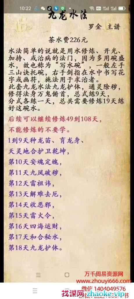 此套九龙水法九龙护体,通灵除秽,修得法身万鬼俯首,总式练9天,分式各练一天,总共需要练19天练好这碗水。1到9天种龙苗、育龙身、天灵地合护卫乾坤第10天安魂定魄第11天九凤破秽第12天雷祖讳第13天解难去厄第14天收恶邪第15天雷火令第16天四海运财,第17天和合秘水,第18天九龙护体。