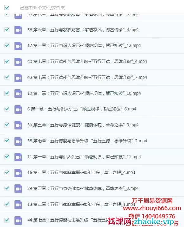 课程内容:第一章:五行识与人识己–“顺应规律,智知己彼第二章:五行与家庭幸福–家和业兴,事业之根第三章:五行与业事成功–“慎善始终,马成到功”第四章:五与行团队组建–“五团行队,商道纵 横”第五章:五行与体身健康–“健体康魄,革之命本”第六章:五与行家族财富–“家家道风,财富传承”第七章:五行 德能与维思升级–“五行五 德,思升维级”