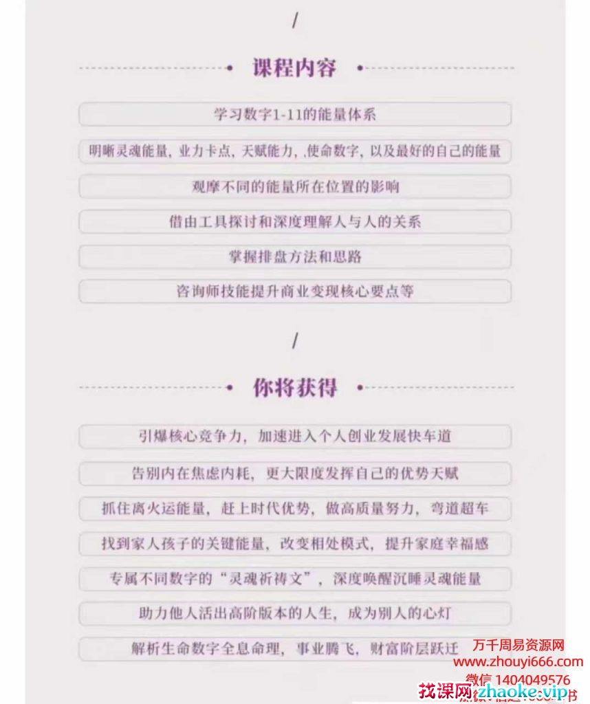 🔸你将获得:1.引爆核心竞争力,加速进入个人创业发展快车道。2.告别内在焦虑内耗,更大限度发挥自己的优势。3.天赋抓住离火运能量,赶上时代优势,做高质量努力,弯道超车4.找到家人孩子的关键能量,改变相处模式,提升家庭幸福感5.专属不同数字的“灵魂祈祷文”,深度唤醒沉睡灵魂能量6.助力他人活出高阶版本的人生,成为别人的心灯7.解析生命数字全息命理,事业腾飞,财富阶层跃迁