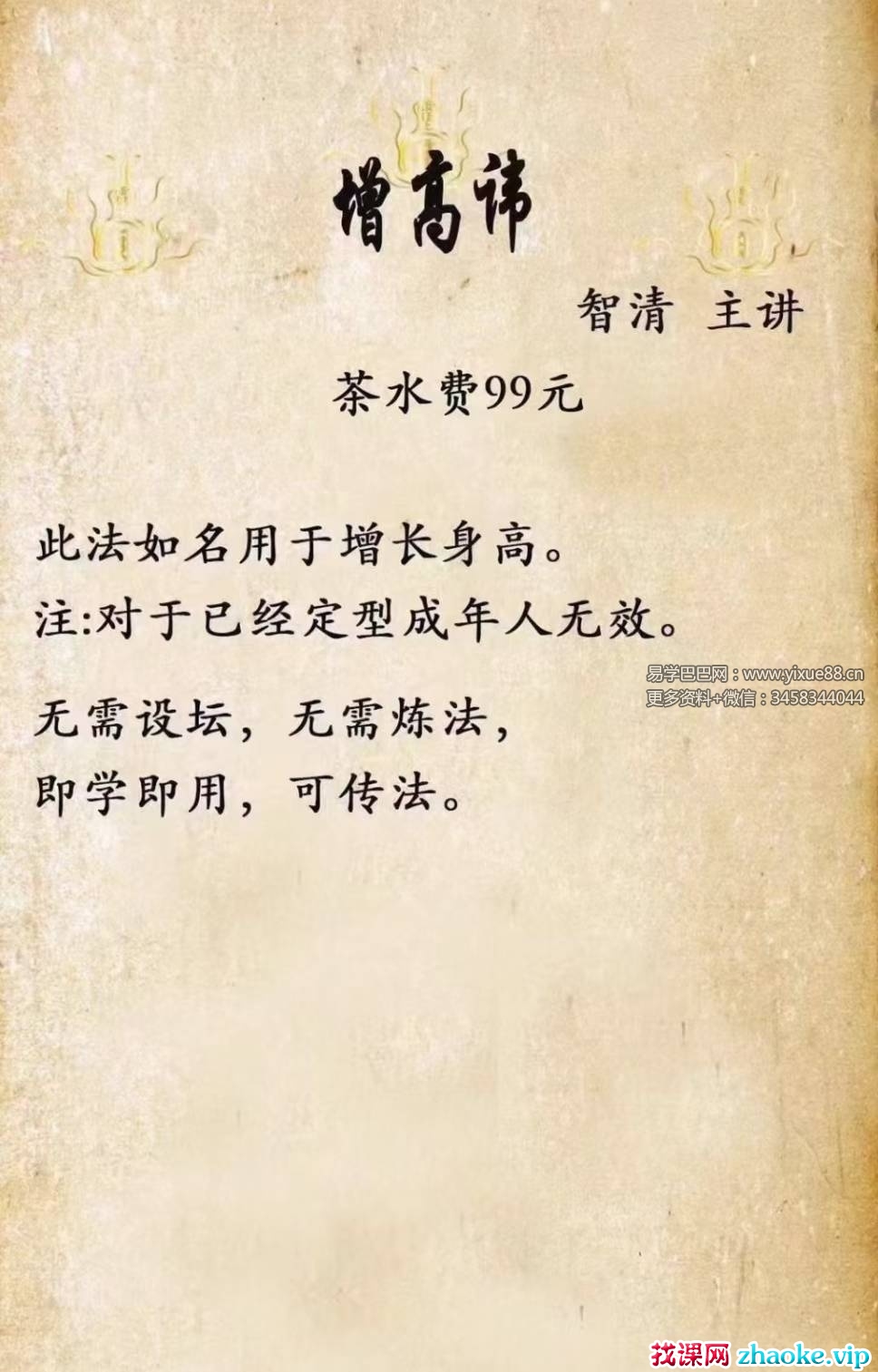 课程编号:Y2504-11最新引进:智清 增高讳此法如名用于增长身高。注:对于已经定型成年人无效无需设坛,无需炼法,即学即用,可传法。