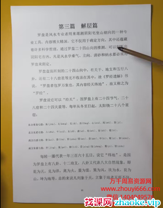 具体目录如下:1:第1课风水的起源2:第2课 指南针的起源3:第3课罗盘的作用与使用4:第4课 阴阳五行 河图洛书5:第5课先后天八卦6:第6课 24山与八卦纳甲7:第7课罗经天地人三盘8:第8课认识九星翻卦掌9:第9课确定坐向与立极10:第10课罗盘分金法11:第11课立向分金法则12:第12课山与水的看法13:第13课排龙诀的用法14:第14课天池先后天八卦水法15:第15课向上天干八路黄泉水16:第16课九星翻卦法17:第17课九星翻卦实用方法18:第18课辅星水法与九星立向19:第19课坐向看龙水实战20:第20课人盘消砂21:第21课天盘纳水22:第22课风水四大局23:第23课透地盈缩六十龙24:第24课28星宿线度五行