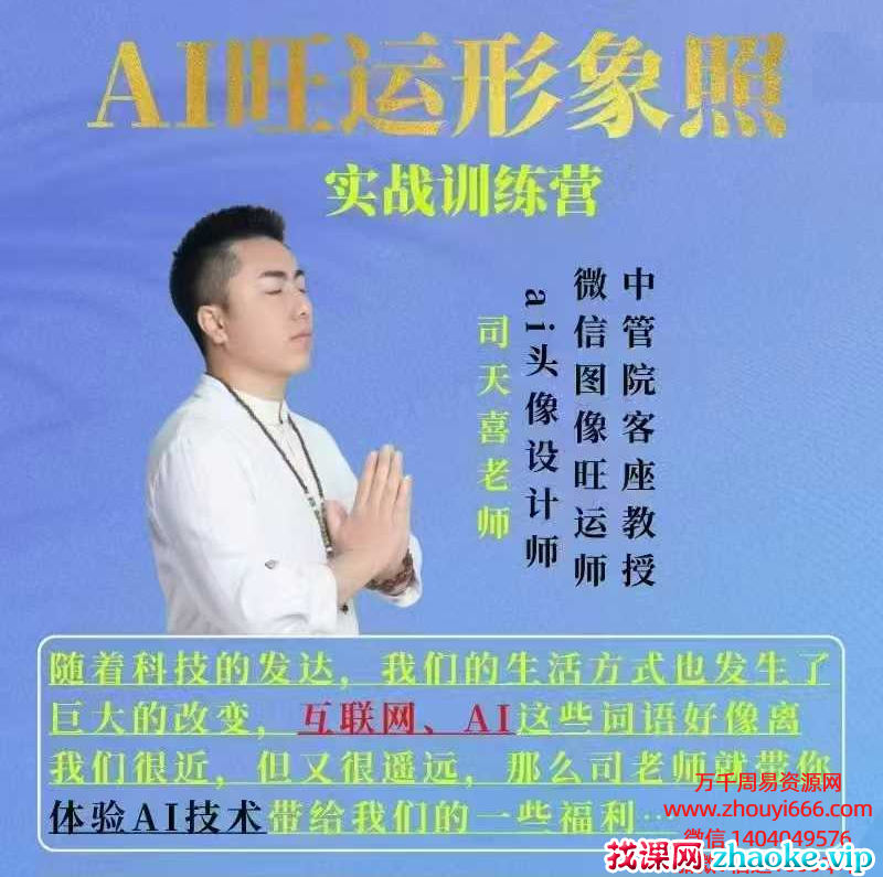 随科着技的发达,,我们的生方活式也发生巨了大的改变,互联网、AI这些词语好像我离们很近,但又遥很远,那么司老就师带你体验AI技术带我给们的一些福利.板块11、为什么要学做习ai形象照?2、学习哎形象照三的大好处?3、ai形象照设计三的大核心?板块21、如获何取ai形象照生成工具?2、如何结命合卦搭配ai形象照?3、如何在ai形象中照植入财库?4、定制ai头像的五个标流准程?板块31、如何通过ai形象照增加财富?2、如帮何助客户交付ai形象照?3、启动ai形象照大四核心流程?