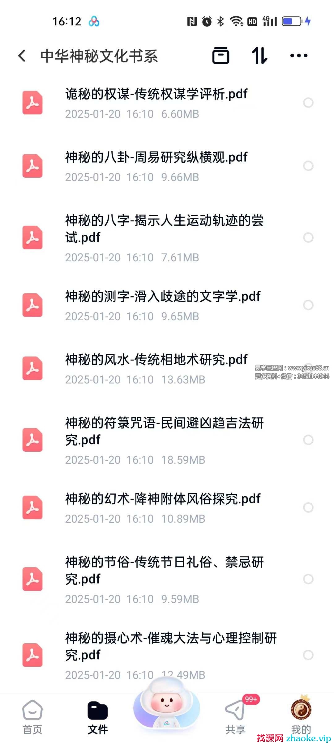 课程编号:Y2506083《中华神秘文化书系列》20部合集包含内容:中华神秘文化词典.pdf真气运行法.pdf神奇的武术-古代体育学觅踪.pdf神秘文化典籍大观.pdf神秘的占候-古代物候学研究.pd