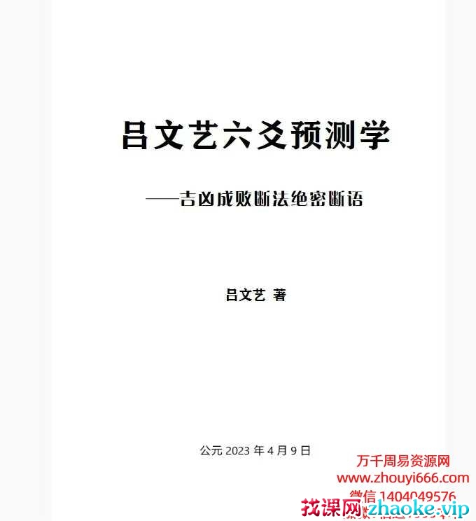 介绍:本断语资料,是对《吕文艺六爻预测学——吉凶成败断法》讲义资料的补充与完善。本断语资料:一是对《吕文艺六爻预测学——吉凶成败断法》讲义中众多师友难以理解的卦例进行了更充分的详细解读;二是对《吕文艺六爻预测学——吉凶成败断法》讲义中没有讲过的“六爻卦吉凶成败断法”的理论技术规定进行了集中展示;三是补充了一部分“六爻卦吉凶断法”的特殊规定断语(在各案例中体现,因有些规定离开案例无法说明白)。在本断语资料中有一个母亲连续七次求测儿子能否被某大学录取为研究生的案例,这些理论彻底打败了传统六爻“卦不过三”的荒谬江湖说法,也直接证明了“吕文艺六爻预测学”理论技术的真理性。