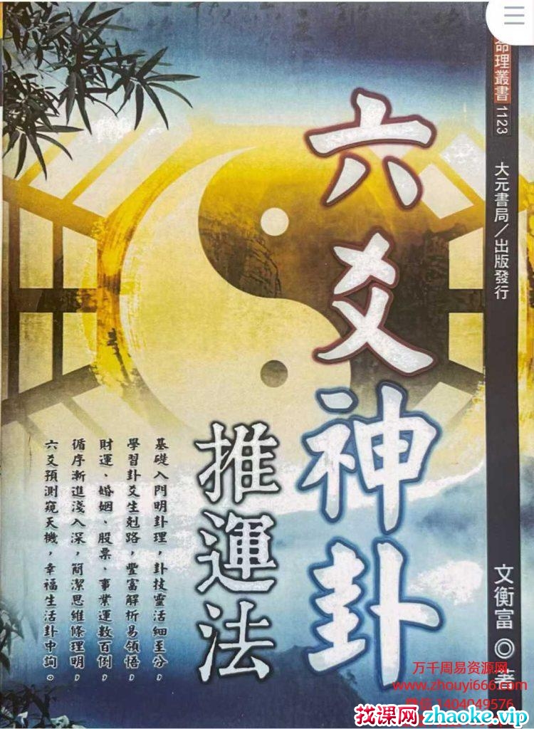 详细介绍六爻卦的玄妙,没有真正深入探究,无法领会,生活点滴都可经由占卦,预先洞悉过程与结果,是一门实用的工具书。 卦可依占卜者的需求,分门别类提供有用的资讯,对单一事件,给予相当准确的建议,能够精确解卦,可为生活带来许多前瞻性的作为,笔者以八字能细看到分的研究精神,同样在占卦上下功夫,发现卦爻之间的生克,有著多层次的讯息,只要有丰富的想像力解卦,就能为生活的决策加分。 本书以作者自身学习六爻卦的经验,引领读者入门,站在学习者的立场,分析卦理,不只是三言两语告知结果,而是将解卦要领无私分享,有兴趣学习者,短期即可领悟奥妙,增强卦技,增添生活色彩,知命掌运!六爻神卦推运法基础入门明卦理,卦技灵活细至分,学习卦爻生克路,丰富解析易领悟,财运、婚姻、股票、事业运数百例, 循序渐进浅入深,简洁思维条理明, 六爻预测窥天机,幸福生活卦中询。