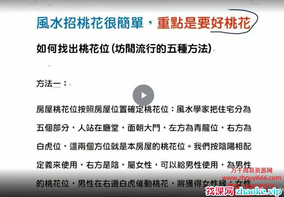 1、如何找出桃花位(坊间流行的五种方法,2、十二种桃花煞3、如何招到好桃花?笔者利用这个方法,已经帮助无数原本桃花缘分薄的男女,让他们有情人终成眷属,也帮助很多正在为另一半烂桃花不断的人,斩断另一半的桃花或寻找到更适合的伴侣,这方法是笔者执业二十几年来,认为是增进桃花最简单、快速、有效的方法。4、实例讲解