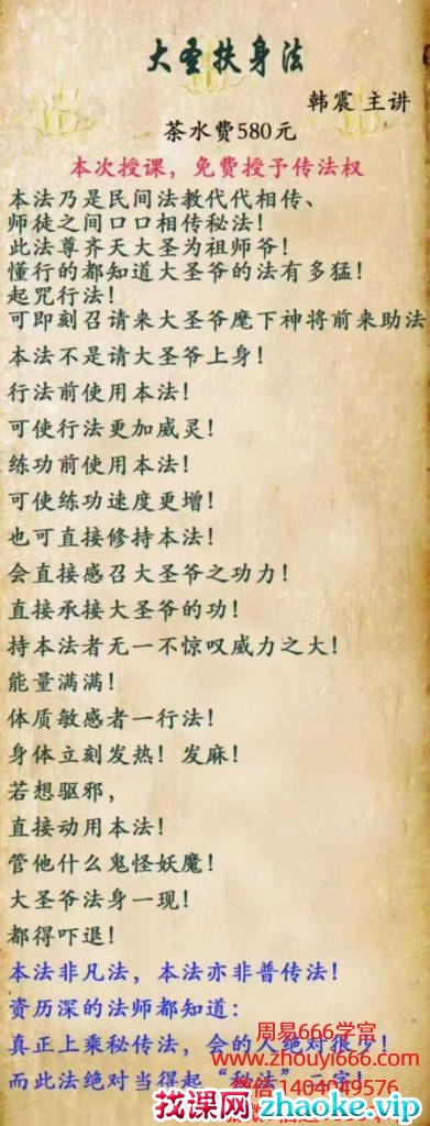 而天今所传《大圣扶身法》,就是大圣的爷法,此法敬大爷圣为祖师爷,接的是圣大爷的功,修的是大圣爷的缘!