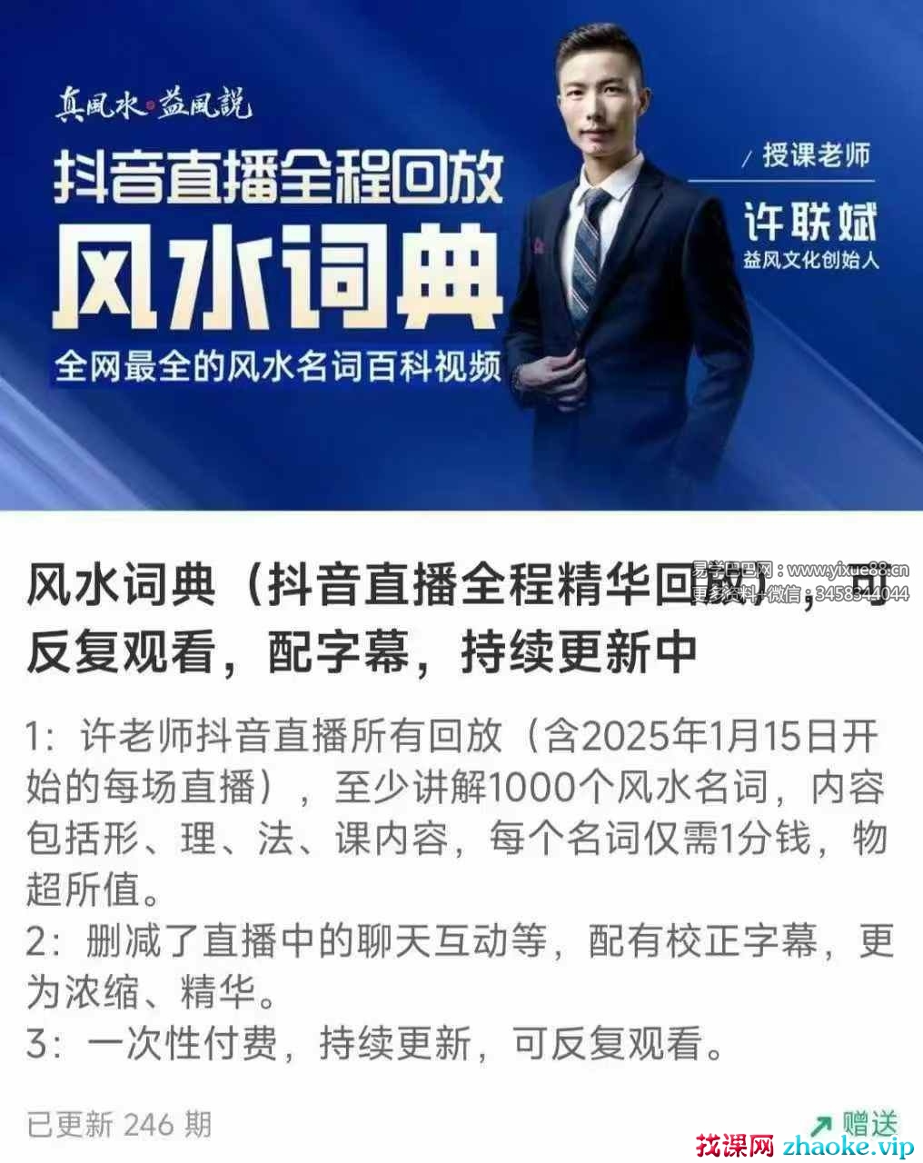 1:许老抖师音直播有所回放(含2025年1月15日开始的每直场播),至讲少解1000个风水名词,内容括包形、理、法、课内容,每个名词仅需1分钱,物所超值。