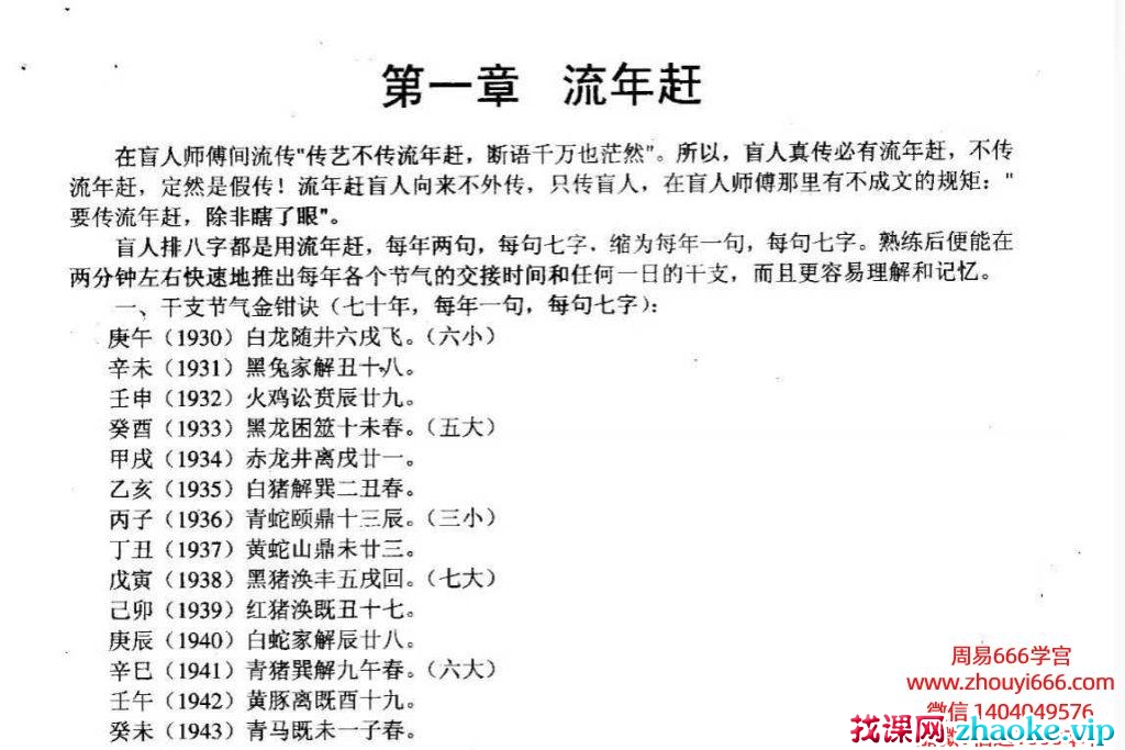在盲人师傅间流传”传艺不传流年赶,断语千万也茫然”。所以,盲人真传必有流年赶,不传流年赶,定然是假传!流年赶盲人向来不外传,只传盲人,在盲人师傅那里有不成文的规矩:要传流年赶,除非瞎了眼”。盲人排八字都是用流年赶,每年两句,每句七字,缩为每年一句,每句七字。熟练后便能在两分钟左右快速地推出每年各个节气的交接时间和任何一日的干支,而且更容易理解和记忆。