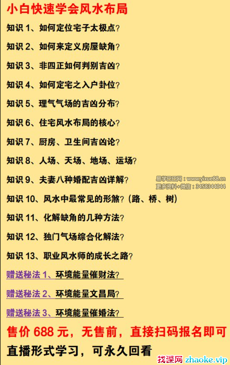 课程编号:Y2510138小白快速学会风水布局知识 1、如何定位宅子太极点?知识 2、如何来定义房屋缺角?知识 3、非四正如何判别吉凶?知识 4、如何定宅之入户卦位?知识 5、理气气场的吉凶分布?知识