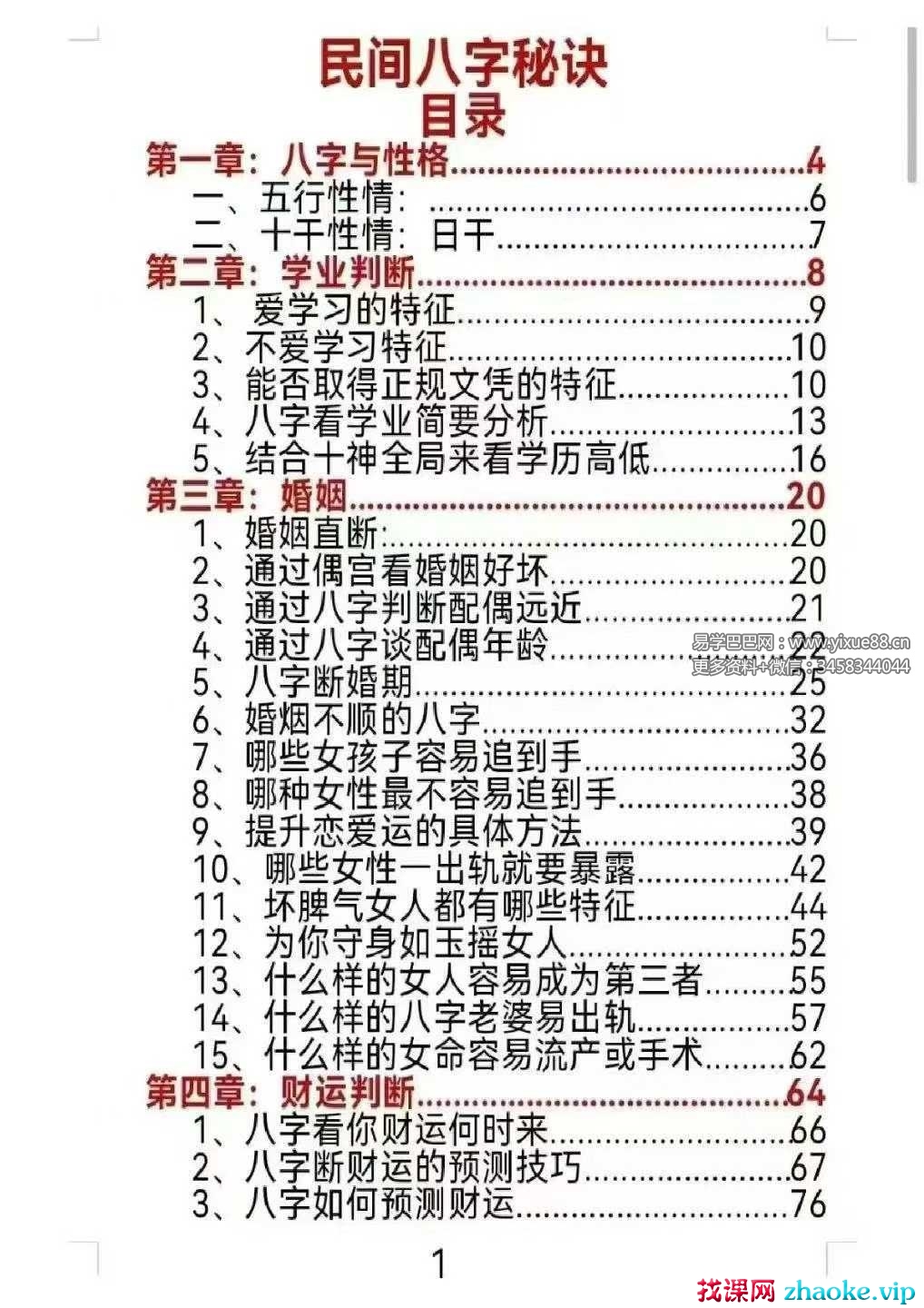 课程编号:Y2510259民间八字命理真传秘解 清晰版!目录第一章:八字与性二、五行性情:十千性情:日干.第二章:学业判断1、爱学习的特征2、不爱学习特征3、能否取得正规文凭的特征4、八字看学业简要分