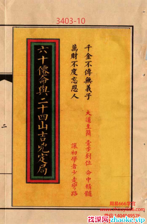 民间祖传风水秘籍《六十仙命与二十四山吉凶定局》彩色精排版页数:68筒子页 136单页内容:堪水风水相关书籍。主要内容有:刺穴煞,刺面煞,泄气,命退,刺害煞,合丧,官符,命坐,神煞的分金宜忌以及葬山吉凶定局,随手翻阅,厉害一览无遗,分金的黄金册,下葬的千金赋,等等…