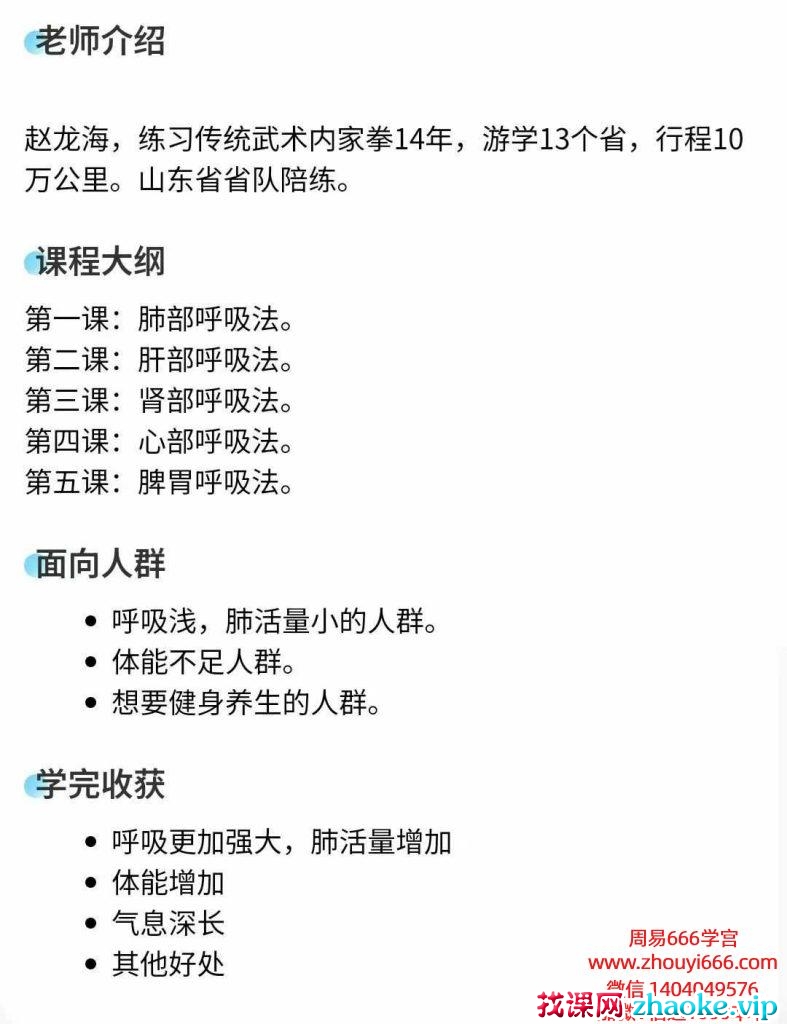 ├── 001.01前言_1.mp4├── 002.第一式——肺部呼吸(修正).mp4├── 003.第二式——肝脏呼吸(修正)_1.mp4├── 004.第三式——肾脏呼吸(修正).mp4├── 005.第四式——心脏呼吸(修正).mp4├── 006.第五式——脾胃呼吸(修正)_1.mp4├── 007.第六式——收功式.mp4├── 008.五行呼吸法与腹式呼吸_1.mp4