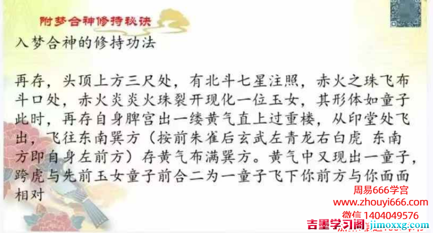 法门介绍不论是帝王将相,抑或贩夫走卒,只要是人都会做梦!入梦术盛行于汉唐两代,黄梁一梦!南坷一梦!可不仅仅是故事而已!谁又能说得清到底是庄周梦成蝶,还是蝴蝶变成了庄周?真实生活有无可能是他人的一场梦?人人之梦各异,夜夜之梦各异,有天有地有人有物皆思成之!可以肯定的说,这绝不是虚幻传说,而是道门神通术!无需设坛,无需任何基础,于睡中修炼,不断强化自身魂魄修为!炼神养命!固身中三魂!唤出童子!出幽入冥!修之愈深,不仅可入他人梦境,也可让他人入你梦境!神异之处不多说,你尽可发挥想象力补充!本法珍贵,修炼过程群内细节指导才是核心!市面绝无仅有!先生法门之殊胜,学过都知!