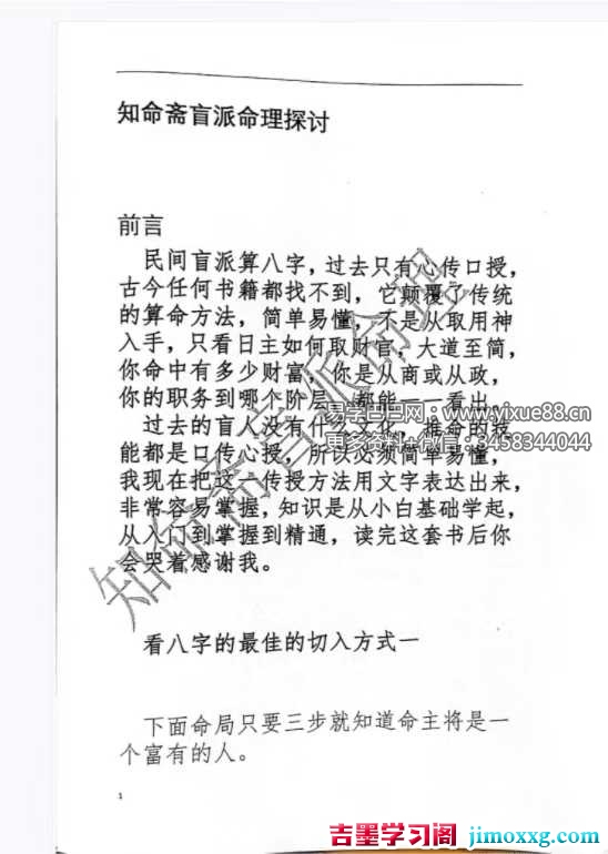课程编号:Y2512212好书推荐《知命斋盲派命理探讨》357页从小白基础学起,从入门到掌握到精通读完这本书。三步知晓命主将来财运1、找财官2、看财官的走向3、看命主是否能得到寅木这官星
