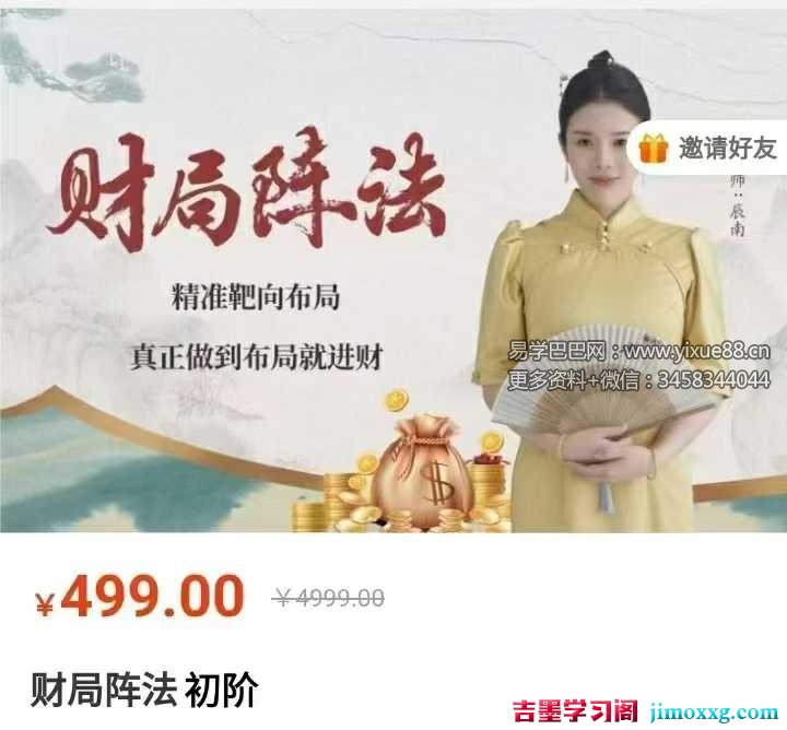 课程编号:Y2512227【辰南】财局阵法初阶1.第一节 九星运财水局之九宫飞星2.第二节 九星运财水局布局方法以及开光方法3.第三节 九五至尊局4.第四节 破煞通财法5.第五节 中药旺宅阵法6.第六