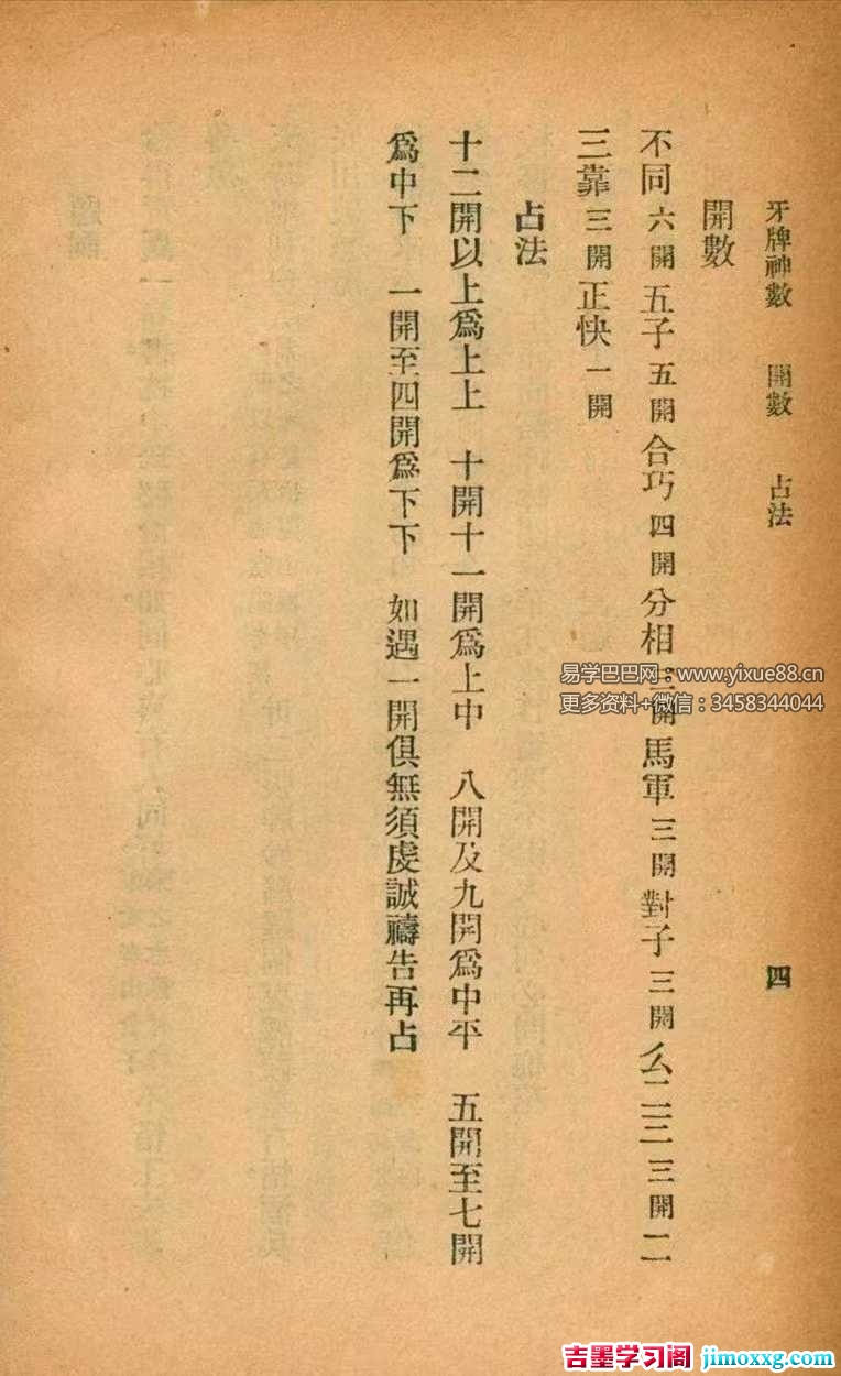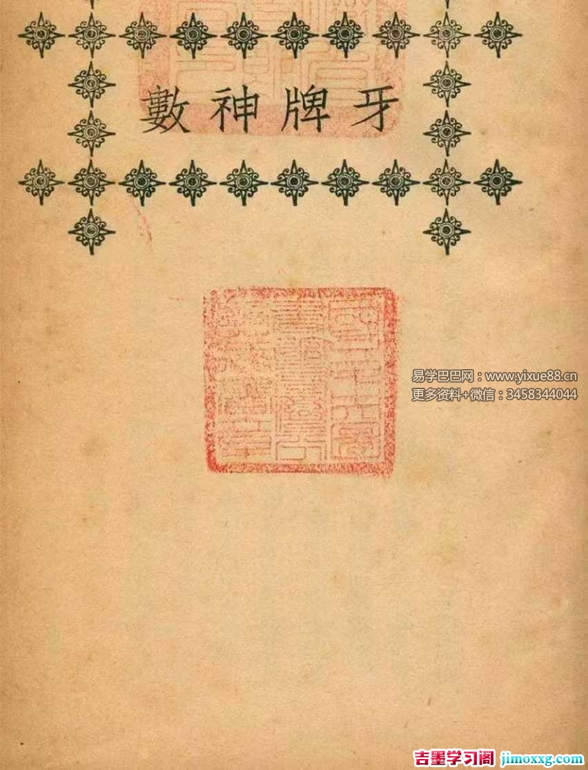 课程编号:Y2510235《牙牌神数》民国版页数:70页《牙牌神数》是传数统术文化中“简易操实型”典籍代的表:以32张牙牌(骨牌)为载体,通过“牌面组合配数-查文条断事”,融合门道