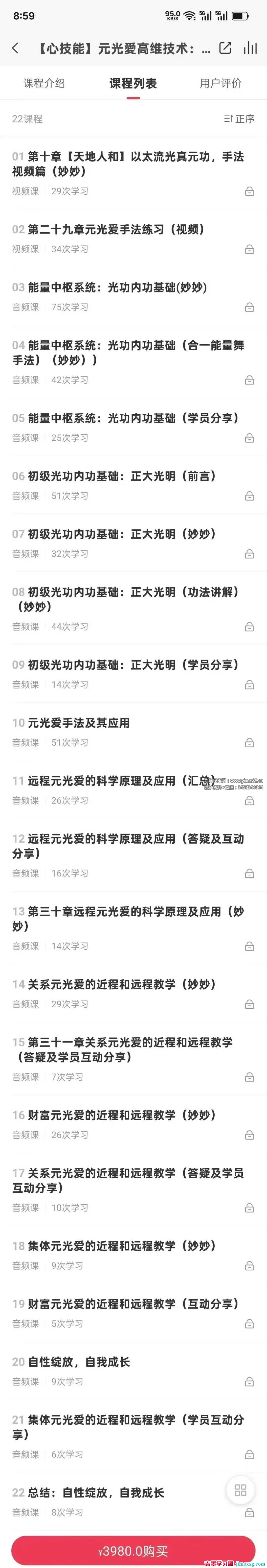 课程编号:Y2509104【元光爱妙妙课】心技能 元光爱高维技术:远程元光爱的学习和应用2集视频+音频以太流光真元功,手法视频篇元光爱手法练习能量中枢系统:光功内功基础能量中枢系统:光功内功基础(合一
