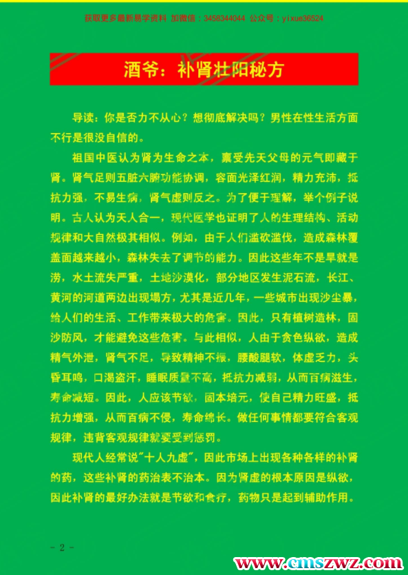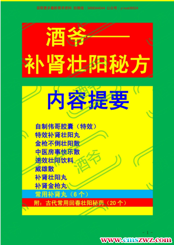 酒爷:补肾壮阳秘方.pdf 15页,传授壮阳丸,金枪不倒药散,房事快乐散,速效壮阳饮料,古代回春壮阳秘药等。注意,关于秘方类,请在医师的指导下使用,所造成的一切后果请自行承当。