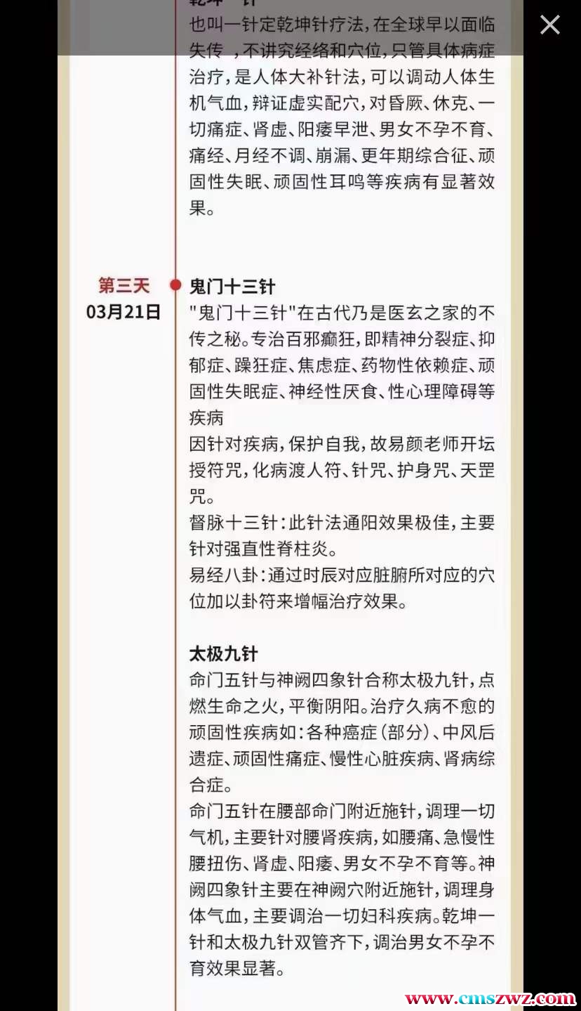 本研习班一一解上读古针法,课有程理(思路、注穴精解)有方(针方、灸方)有药(药方)、有符(化渡病人)、有咒、修功德、练天先功法,主要治阳疗虚、晕厥、一切痛症、肾虚、各脑类瘫、脑梗、结石类、阳微早歇、男不女孕不育、痛经、月经不调宫子瘤、卵囊巢肿、癫痫、各种肿瘤(部分癌症)、痛风、强直性柱脊炎、高血压、高血脂、糖尿病、精神裂分症、抑郁症、强迫症顽等固型难疑杂病及后产修复、美等容等