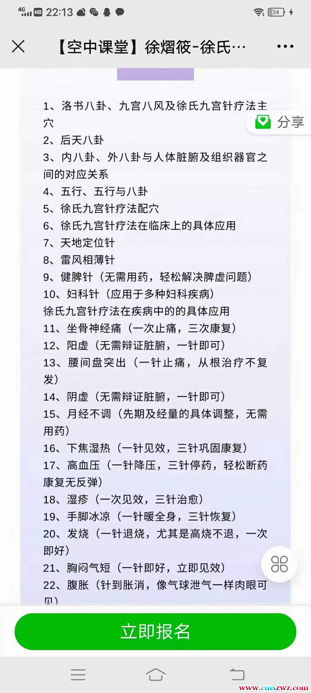 课程编号:D2311-13炸裂针灸好课徐熠筱徐氏九宫针法课程介绍:1、洛书八卦、九宫八风及徐氏九宫针疗法主穴2、后天八卦3、内八卦、外八卦与人体脏腑及组织器官之间的对应关系4、五行、五行与八卦5、徐氏