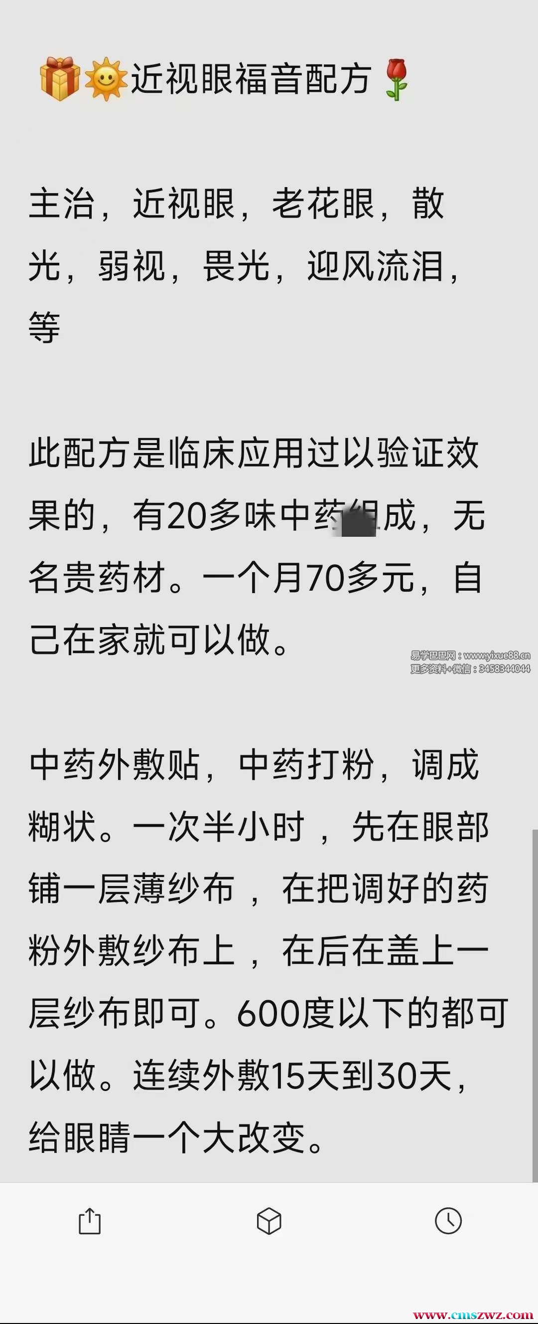 课程编号:Y2402-64最新引进:近眼视福音配方主治:近视眼,老花眼,散光,弱视,畏光,迎流风泪,等此配方是临床应用以过验证效果的,有20多中味药组成,无名药贵材。一个月70多元