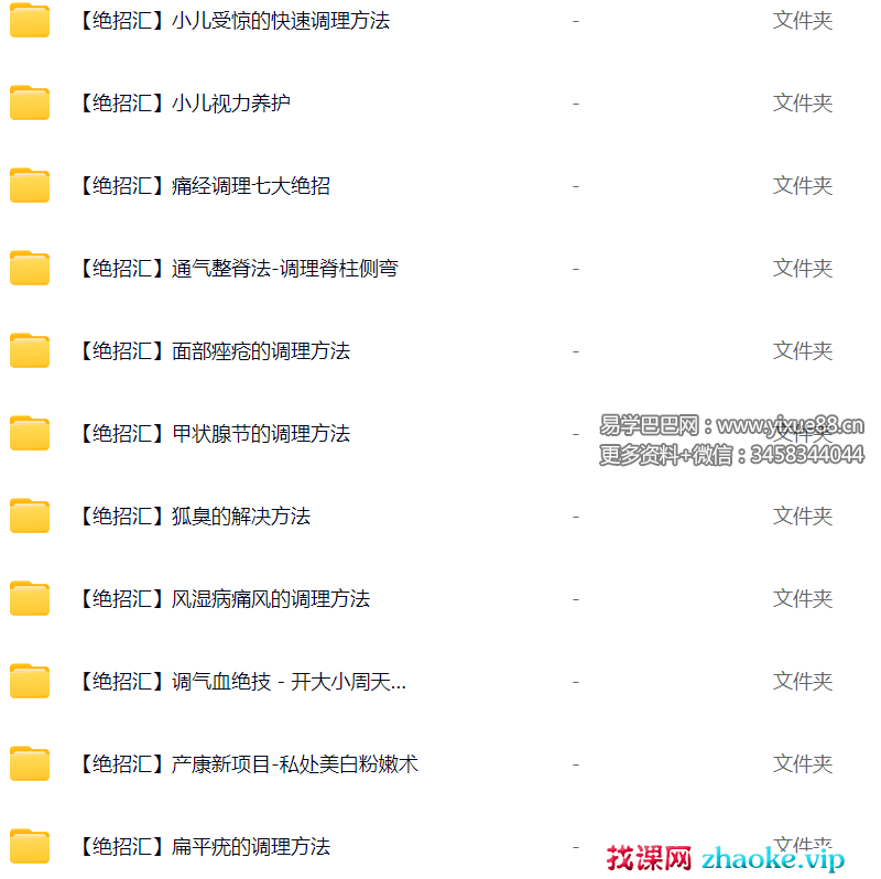 课程编号:Z2403-21【绝招汇】小儿受惊的快速调理方法【绝招汇】小儿视力养护【绝招汇】痛经调理七大绝招【绝招汇】通气整脊法-调理脊柱侧弯【绝招汇】面部痤疮的调理方法【绝招汇】甲状腺节的调理方法【绝