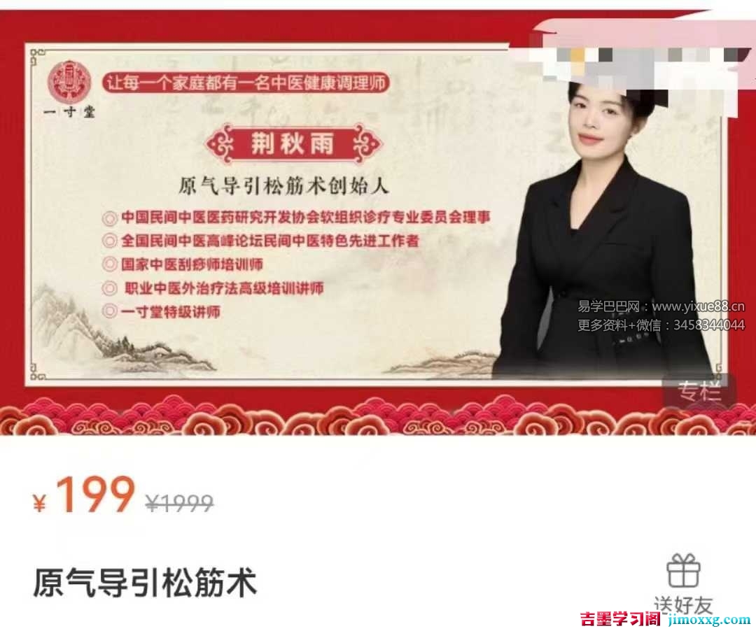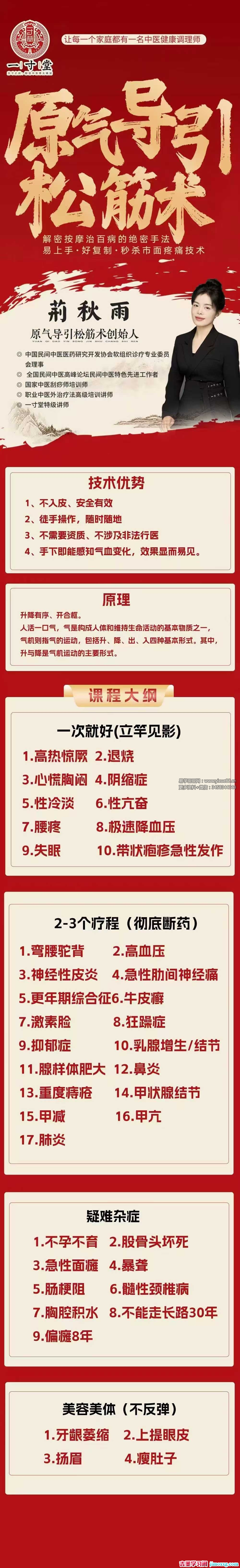 课程编号:Y2509021荊秋雨《原气导引松筋术》[礼物]一次就好(立竿见影)1.高热惊厥2.退烧3.心慌胸闷4.阴缩症5.性冷淡6.性亢奋7.腰疼8.极速降血压9.失眠10.带状疱疹急性发作[礼物]