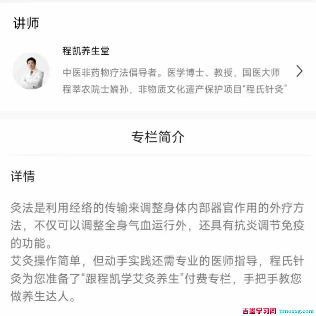 艾灸操作简单,但动手实践还需专业的医师指导,程氏针灸为您准备了“跟程凯学艾灸养生”付费专栏,手把手教您做养生达人。